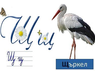 | Щ Щъркел на комина щръкнал, клечки за гнездо домъкнал. Дом строи за четирима – щъркелчета ще си има. | |
