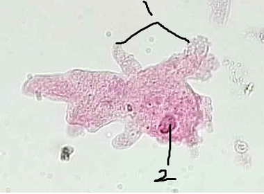 Common name: Nonparasitic amoeba D: Eukarya K: Protista P: Rhizopoda C: G: Amoeba s: proteus 1. Pseudopods 2. Nucleus |
