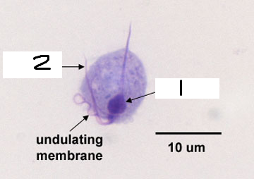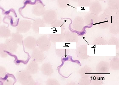 Common name: Extracellular blood parasite D: Eukarya P: Protista P: Euglenozoa C: G: Trypanosoma s: species 1. Kinetoplast 2. RBC 3. Flagella 4. Undulating membrane 5. Nucleus |