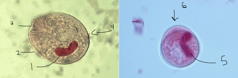 Common name: Intestinal Parasite D: Eukarya K: Protista P: Ciliophora C: G: Balantidium s: coli 1. Macronucleus 2. Cilia 3. Cytostome 4. Trophozoite 5. Macronucleus 6. Cyst |