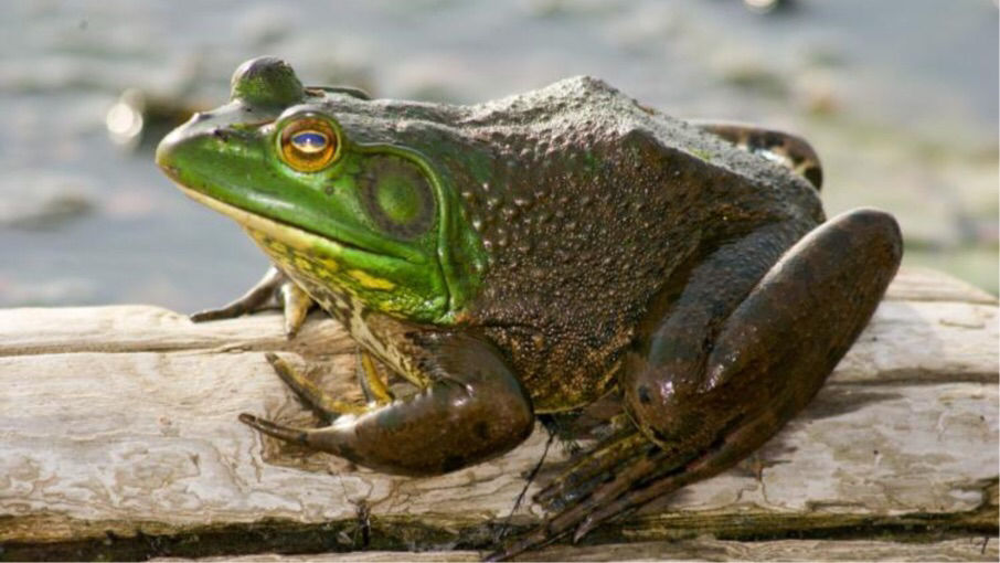 American Bullfrog Lithobatus catesbeianus or Rana catesbeianus The forth back toe isn't webbed nor are the forelimbs. Males have yellow throats and are smaller then females. |