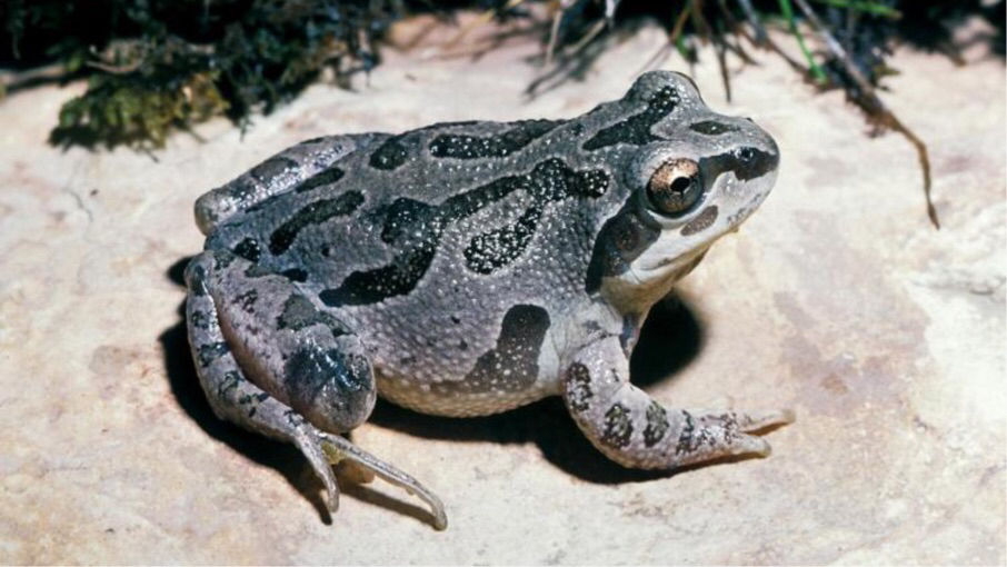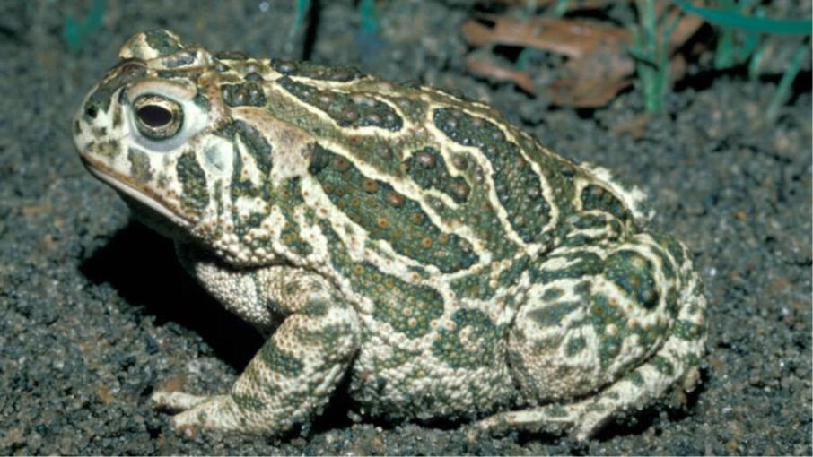 Great Plains Frog Anaxyrus cognatus Look for green or dark brown blotches encircled with white or tan. Carnal ridges form a V. Parotid glands are small. |
