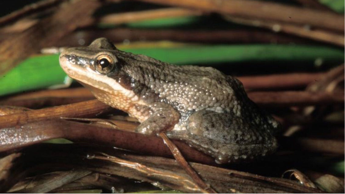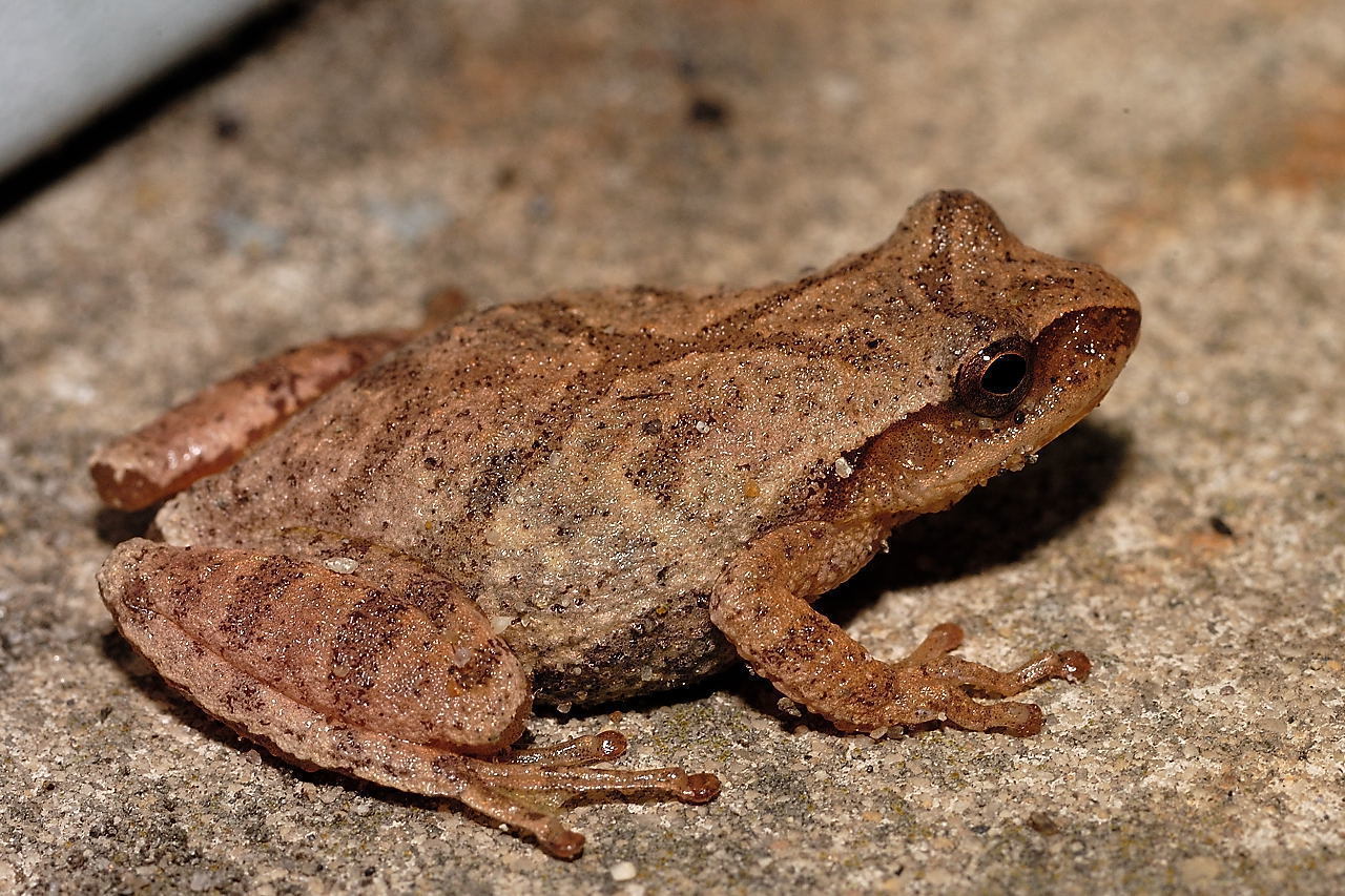 Illinois Chorus Frog Pseudacris Illinoensis Tan to tannish grey with dark brown or grey markings. They have a V between their eyes and a mark under them. Froglets are dull grey. |