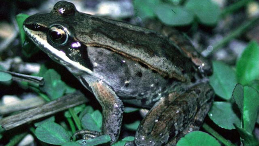 Wood Frog Lithobates sylvaticus Distinguished by the dark street near its eye. They can be grey, red, green, or brown with females being slightly brighter. |