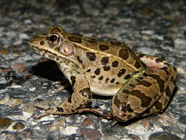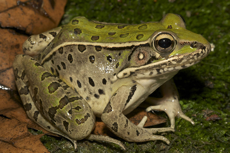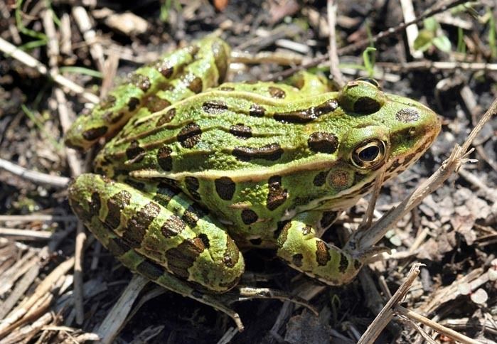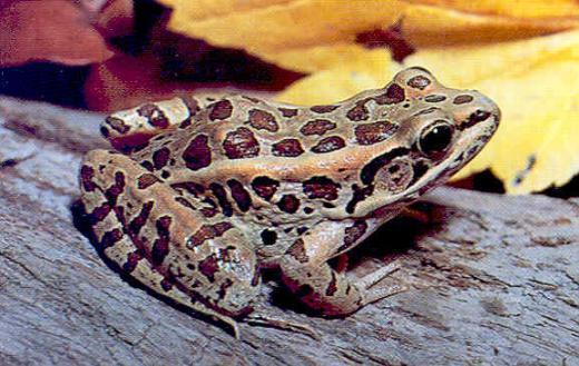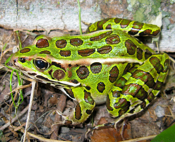 | Northern Leopard Frog Lithobates pipiens or Rana pipiens It reaches 4.3 inches. It varies from green to brown in color, with large, dark, circular spots on its back, sides, and legs, each spot is normally bordered by a lighter ring. | |