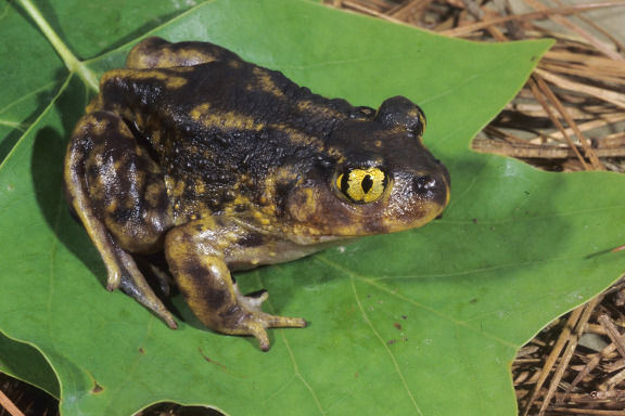 | Eastern Spadefoot Toad Scaphiopus holbrookii Skin is smoother and moister then other toads. Coloration is tan or yellowish to dark brown, without bold spots. They have yellow eyes with cat-like pupils. 2 lines descending from behind the eyes. | |