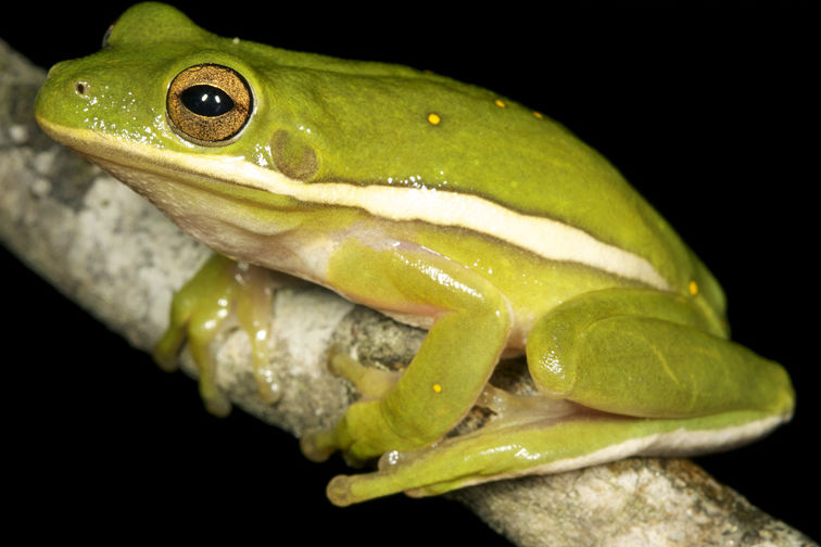 | American Green Treefrog Hyla Cinerea It is green with a white, yellow or iridescent stripe along each side of the body. The length of these stripes varies and may not be present at all. Additionally, yellow flecks are often found on the dorsum of some individuals. | |