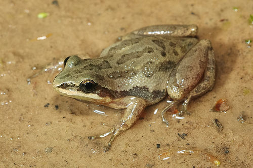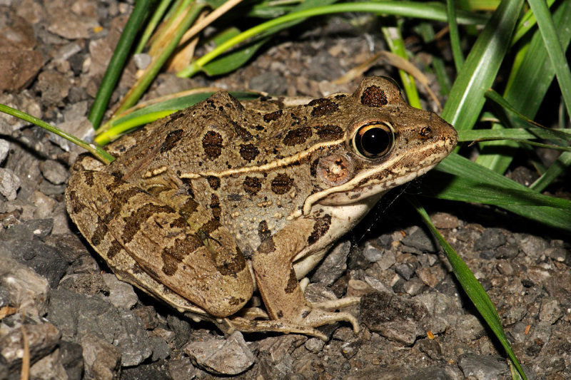 | Southern Leopard Frog Lithobates sphenocephalus or Rana sphenocephala Measures about 2 to 3.5 inches. It has a light line along its upper jaw, light spot on its tympanum. They prefer shallow fresh water. | |