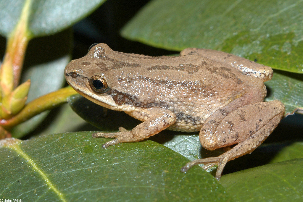 Boreal Chorus Frog Pseudacris maculata The upper lip is normally white. A dark spot exists between the eyes. |