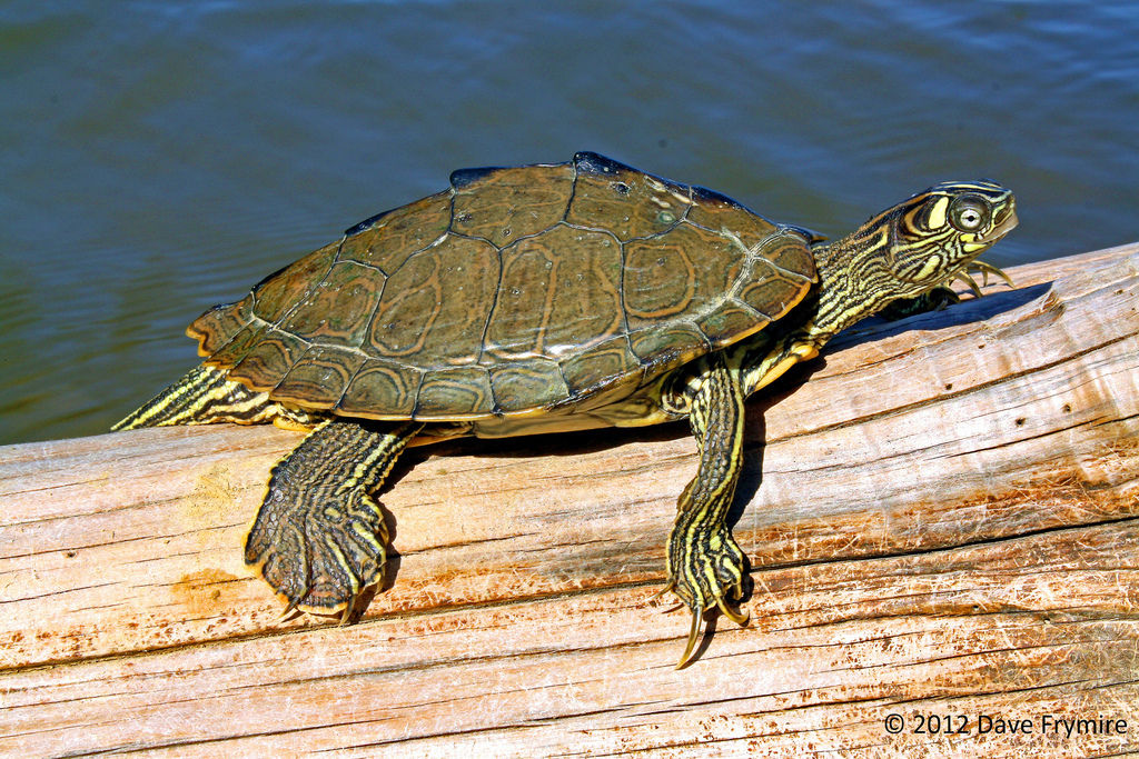 | Ouachita Map Turtle Graptemys ouachitensis ouachitensis It has a prominent ridge down the center of the upper shell. It has yellow lines on its limbs and head. The upper shell is olive or brown, with connected yellow lines and circles. The head and limbs are olive with lots of thin yellow lines. There is a yellow or orange-yellow marking behind and below each eye |