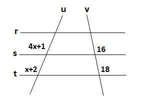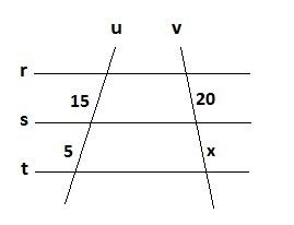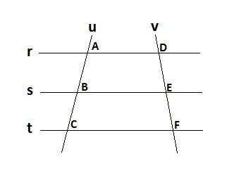 | Na figura as retas transversais u e v interceptam as retas paralelas r, s e t. Os pontos pertencentes na reta u são: A, B e C; e na reta v, os pontos: M, N e O. Logo, de acordo com o Teorema de Tales: Lê-se: AB está para BC, assim como DE está para EF. | |