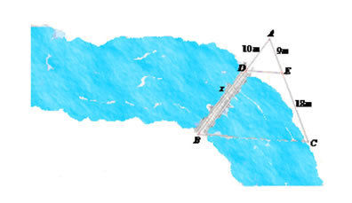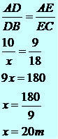 De acordo com a figura temos um triângulo ABC e o segmento DE dividindo o triângulo, sendo formado o triângulo ADE. As informações que temos são as medidas dos seguintes segmentos: AD = 10m, AE = 9m, EC = 18m e DB = x. O valor de DB será determinado através do Teorema de Tales que diz: “retas paralelas cortadas por transversais formam segmentos proporcionais.” Desse modo, podemos estabelecer a seguinte relação: