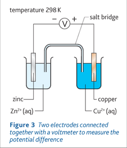 how potential difference (V) cannot be measured directly so what do we do? | we connect together two different electrodes and measure the potential difference between them using a voltmeter. |