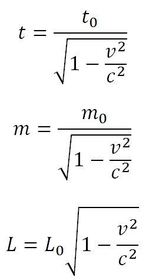 | What are the equations for time, mass and length dilation? |