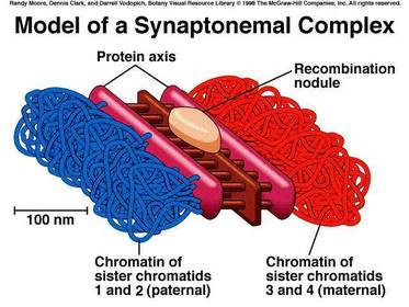 | How does recombining of genetic info. occur? | Recombining of genetic information by segregation, random orientation of chromosomes, and crossing over |