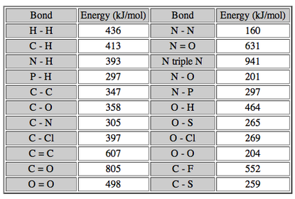 Bond energy | Energy needed to break the bonds between two atoms is called the bond energy for that bond. Bond energies are measured in kJ/mol. We can bond energies to work out the energy change (/\H) for many chemical reactions. To calculate the energy change for a chemical reaction we must work out: - How much energy is needed to break the chemicals bonds in reactants - Then how much energy is released when the new bonds are formed in the products Data in the table is the energy required to break bonds when we want to know the energy released as these bonds are formed the amount of energy is the same. Ex. Bond energy of C-C bond is 347kJ/mol which means that the energy released forming a C-C bond is also 347kJ/mol. |