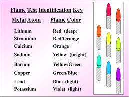 Test for positive ions: Flame test- Though Lithium is crimson, potassium lilac, barium green, calcium red only one that's right is sodium. | Some metal ions produce flames with a characteristic colour. To carry out a flame test: - Put a small amount of the compound to be tested in a nichrome test loop (wire loop should be dipped in concentrated hydrochloric acid and heated first to clean it then dipped in acid before dipping in the metal compound). - Hold the loop in the roaring blue flame of a Bunsen burner - Use the colour of the Bunsen flame to identify the metal ion in the compound |