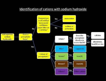 Reactions with sodium hydroxide | Reactions with sodium hydroxide solutions can also help us identify some positive ions. Aluminum ions, calcium ions and magnesium ions all form white precipitates with sodium hydroxide solution. So if a white precipitate form we know an unknown compound contains either Al3+, Ca2+ or Mg2+ ions. If we add excess sodium hydroxide aluminium ions dissolve though the white precipitate formed with calcium and magnesium ions will not. Calcium and magnesium ions can be distinguished with a flame test - calcium ions give a brick red flame but magnesium ions produce no colour at all. Some metal ions form coloured precipitates with sodium hydroxide. If we add sodium hydroxide solution to a substance containing: - copper (II) ions, a blue precipitate forms - iron (II) ions, a green precipitate will form - iron (III) ions, a brown precipitate is formed |