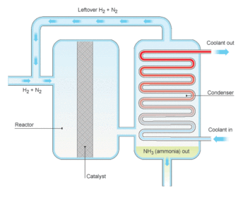 Economics of Haber process - Effect of temperature | Forward reaction is exothermic, so if temperature is low this would increase the amount of ammonia in the reaction mixture as equilibrium but at a low temperature the rate of the reaction would be very slow, as the particles would collide less often and would have less energy. To make ammonia commercially we must get the reaction to go quickly, we don't want to waste time waiting for the ammonia to be produced. to do this we need a compromise, a reasonably high temperature is used to get the reaction at a reasonable rate even though this reduces the yield of ammonia. |