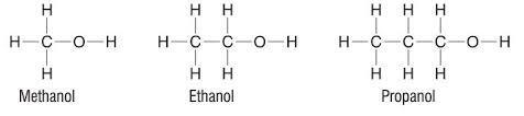 Alcohols | Ethanol, a biofuel, is an alcohol. An alcohol is similar to an alkane molecule but has a H atom removed and replaced with and O-H group giving us an alcohol molecule. The -OH group of atoms is an example of a functional group. A functional group gives each type of organic compound their characteristic reactions. All the compounds with the same functional group is called a homologous series. Name alcohols from the alkane with the same number of carbon atoms, take the 'e' from the end of the alkane's name and replace it with 'ol'. Formula of ethanol may be written as C2H6O but more information can given in a structural formula which for ethanol would be CH3CH2OH often shortened to C2h5OH |