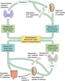 Stimulus : calcium élevé/faible dans le sang Centre de régulation : glande thyroïde Réponse physiologique : déposition de calcium dans les os ou absorption de calcium par les reins |