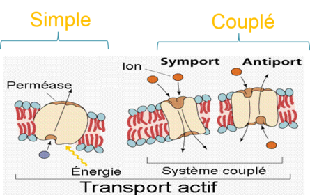 Transport membranaire actif se fait à l'encorte du gradient de concentration Simple : une seule molécule spécifique passe par perméase Double : différentes molécules passent simultanément par symport (une direction)/antiport (2 directions) *À l'encontre parce que la solution typique n'est pas utilisée; c'est l'inverse* |
