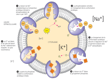 1) Liaison du NA de l'intérieur au protéine de transport stimule la phosphorylation de celui-ci par ATP 2) Phosphorylation entraîne un changement de la forme du protéine de transport 3) Changement de la forme cause l'expulsion du NA et permet la liaison avec K de l'extérieur 4) Liaison du K libère le groupement phosphate 5) Libération de phosphate ramène le protéine à sa forme initiale 6) K est libéré et les sites de réception NA se réactivent |