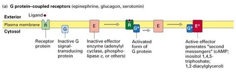 1) Protéine récepteur à l'extérieur reçoit le ligand (réaction primaire) 2) G : inactive jusqu'à ce que le ligand entre 3) E : effecteur inactive jusqu'à ce que le ligand entre 4) RG : G devient active (réaction secondaire) 5) GE : crée des messagers (réaction secondaire) |