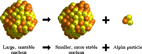 (A)The atom decays to become stable. It ejects an alpha particle. Leaving it with 2 protons and neutrons less. Ionising radiation is given off.