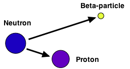 (B) The atom converts a neutron into a proton and an electron. The electron is ejected. Proton stays in nucleus changing element.