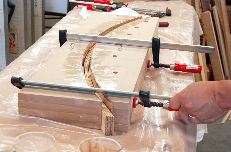 | Laminating Wood is usually bent by laminating. This is done by cutting thin strips of wood, putting glue on the strips and clamping them into a mould. | |