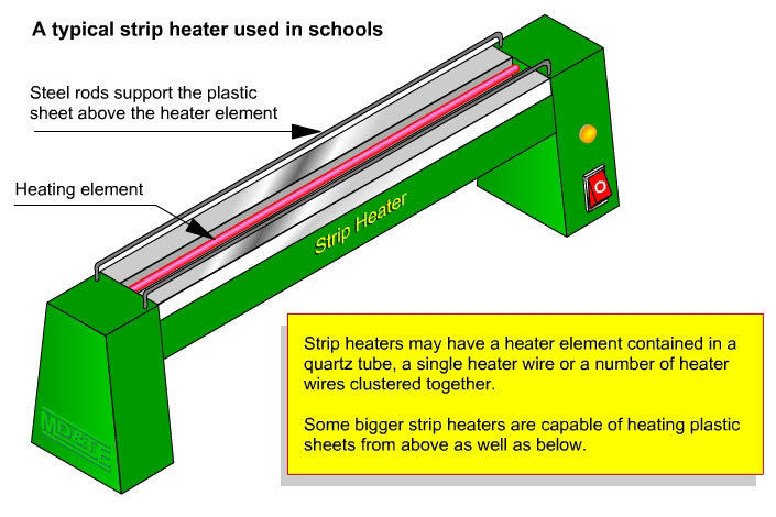 Thermoplastics cannot be bent when cold. They are bent using a strip heater or line bender which will heat the plastic in a straight line, so it can be bent by hand. |