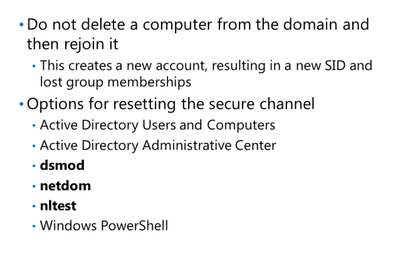 | Every member computer in an AD DS domain maintains a computer account with? What does it store? | a user name (SAMAccountName) and password computer stores its password in the form of a local security authority (LSA) secret, & changes its password with the domain approx every 30 days |