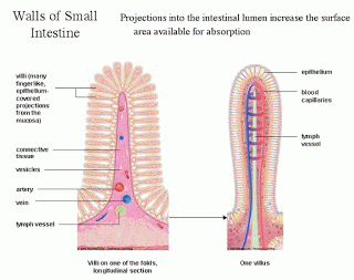 | What do the villi have/do to provide a surface area? | Have an extensive network of capillaries to absorb products of digestion by diffusion and active transport. |