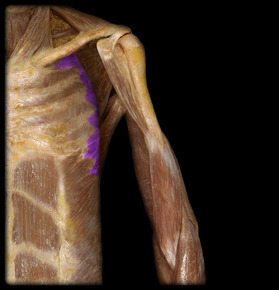 | Pectoralis Major * | Origin: clavicular head (medial part), sternocostal head: sternum, costal cart 1-6 Insertion: Lateral pectoral nerve c5-7 Action: adduction of arm, medial rotation of arm, flexion of arm |