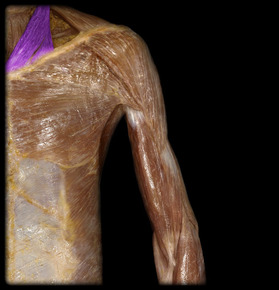 | Trapezius * | Origin: Occipital bone, nuchal ligament, Insertion: Clavicle lateral, Scapula Action: Upper fibers; elevation of scapula, rotation of scapula, adduction of scapula, depression of scapula |