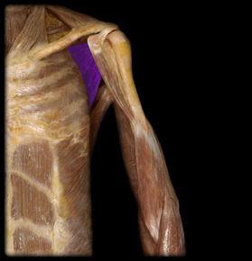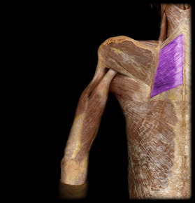 | Latissium dorsi | Origin: sacral and lumbar spines, ilium, ribs Insertion: Humerus Action: adduction of arm, extension of arm, medial rotation of arm. |