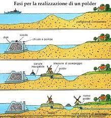 I polder olandesi sono pianure create dall'uomo grazie ad un'opera di bonifica di aree prima occupate dal mare; liberate dalle acque queste pianure possono essere coltivate e abitate dall'uomo che vi costruisce insediamenti. |