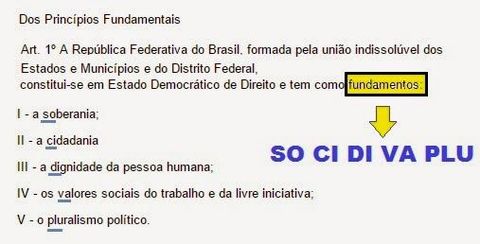| Art 4º A República Federativa do Brasil rege-se nas suas relações internacionais pelos seguintes princípios: AInDa Não ComPreI ReCoS | A – autodeterminação dos povos In – independência nacional D – defesa da paz Não – não intervenção Co – cooperação entre os povos para o progresso da humanidade Pre – prevalência dos direitos humanos I – igualdade entre os Estados Re – repúdio ao terrorismo e ao racismo Co – concessão de asilo político S – solução pacífica dos conflitos |