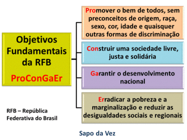 | Art 3º Objetivos fundamentais da RFB PRO CON GA ER Verbos no infinitivo (PROMOVER, CONSTRUIR, GARANTIR E ERRADICAR) | |