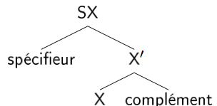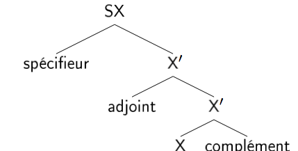 | La théori X-Barre | veut que chaque syntagme soit représenté par le schema ou x est un catégorie grammaticale. |