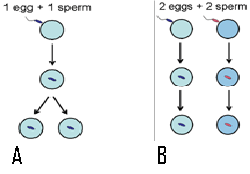 | What do A and B represent? | A represents 1) the fertilization of an egg 2) The fertilized egg 3) The fertilized egg spilts into two eggs, producing two IDENTICAL twins B represents 1) 2 separate eggs separately fertilized 2) producing fraternal twins |