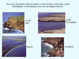 | La costa è un tratto di terra emersa che confina con il mare; essa può essere: a. alta, b. frastagliata, c. può formare una laguna o d. presentarsi come una scogliera. Nella foto le diverse tipologie di costa. | |