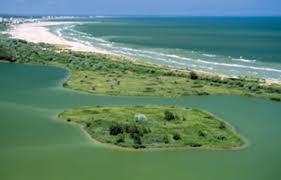 I materiali sedimentari possono essere accumulati dalle correnti marine formando i lidi. Nella foto i lidi di Comacchio e una piccola laguna. |