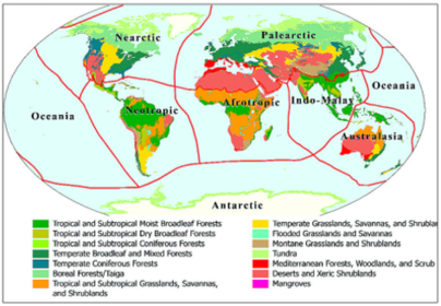 | What are the 8 biogeographic realms? | Nearctic, Neotropic, Afrotropic, Oceanic, Palearctic, Antarctix, Indo-malay, Australasian. |