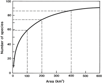 | On a species area curve, what do larger areas signify? | Larger areas tend to contain larger numbers of species, and empirically, the relative numbers seem to follow systematic mathematical relationships. |