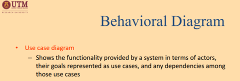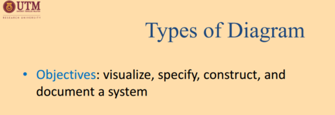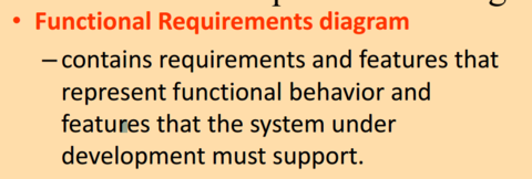 | Requirements Diagram | - Mengandungi syarat-syarat dan ciri-ciri yang mewakili perilaku fungsi dan mempunyai bahawa sistem di bawah pembangunan harus mendukung |