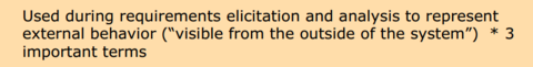| Digunakan semasa keperluan elisitasi (kepintaran) dan analisis untuk mewakili tingkah laku luaran ("terlihat dari luar sistem") * 3 istilah penting | |