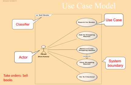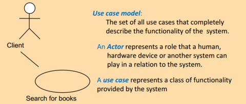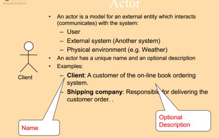 | Seorang pelakon adalah model untuk entiti luaran yang berinteraksi (berkomunikasi) dengan sistem: - Pengguna - Sistem Luaran (Satu lagi sistem) - Persekitaran fizikal (misalnya Cuaca) • Seorang pelakon mempunyai nama yang unik dan deskripsi pilihan • Contoh: - Pelanggan: Pelanggan dari buku pesanan dalam talian sistem. - Syarikat Penghantaran: Bertanggungjawab menyampaikan pesanan pelanggan. . | |