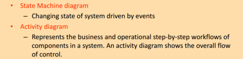 | - Menukar keadaan sistem didorong oleh kejadian - Merupakan perniagaan dan operasi langkah-demi-langkah aliran kerja dari komponen dalam suatu sistem. Rajah aktiviti menunjukkan aliran keseluruhan kawalan. | - Menjelaskan struktur sistem dengan menunjukkan sistem ini kelas, ciri-ciri mereka, dan hubungan di antara kelas-kelas. -Menggambarkan bagaimana sistem perisian dibagi menjadi komponen dan menunjukkan ketergantungan di antara komponen ini |